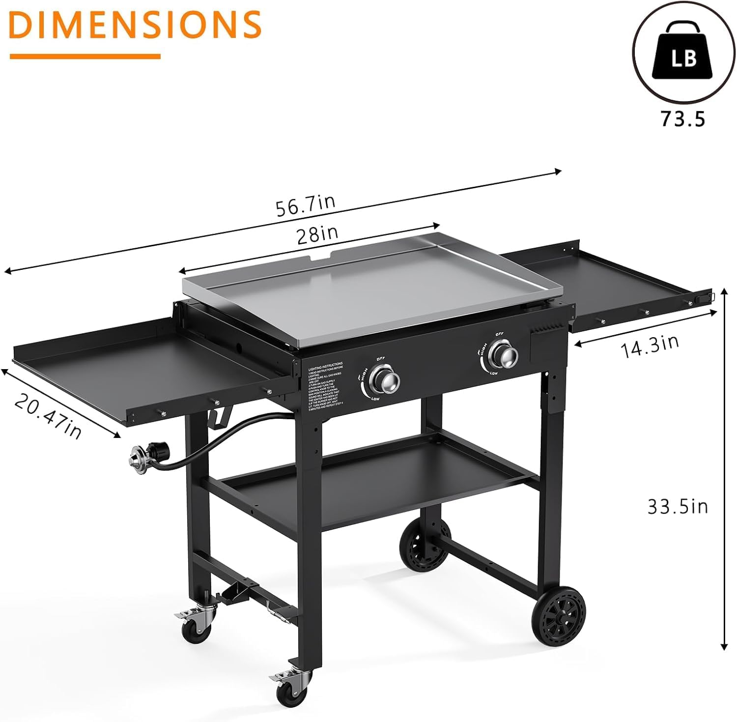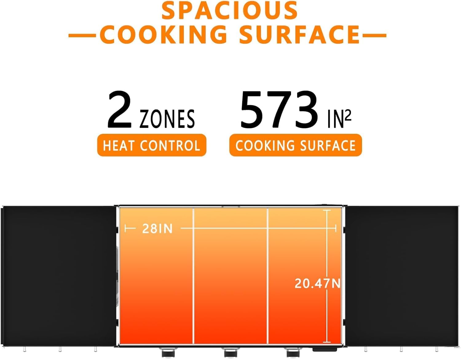 • Spacious Cooking Surface: The 532 square inch cooking surface provides plenty of space for most grilling enthusiasts. 19 inch× 28 inch large cooking area. Flat top grills allow you to easily flip food, as the large flat surface offers more room for inserting a spatula.