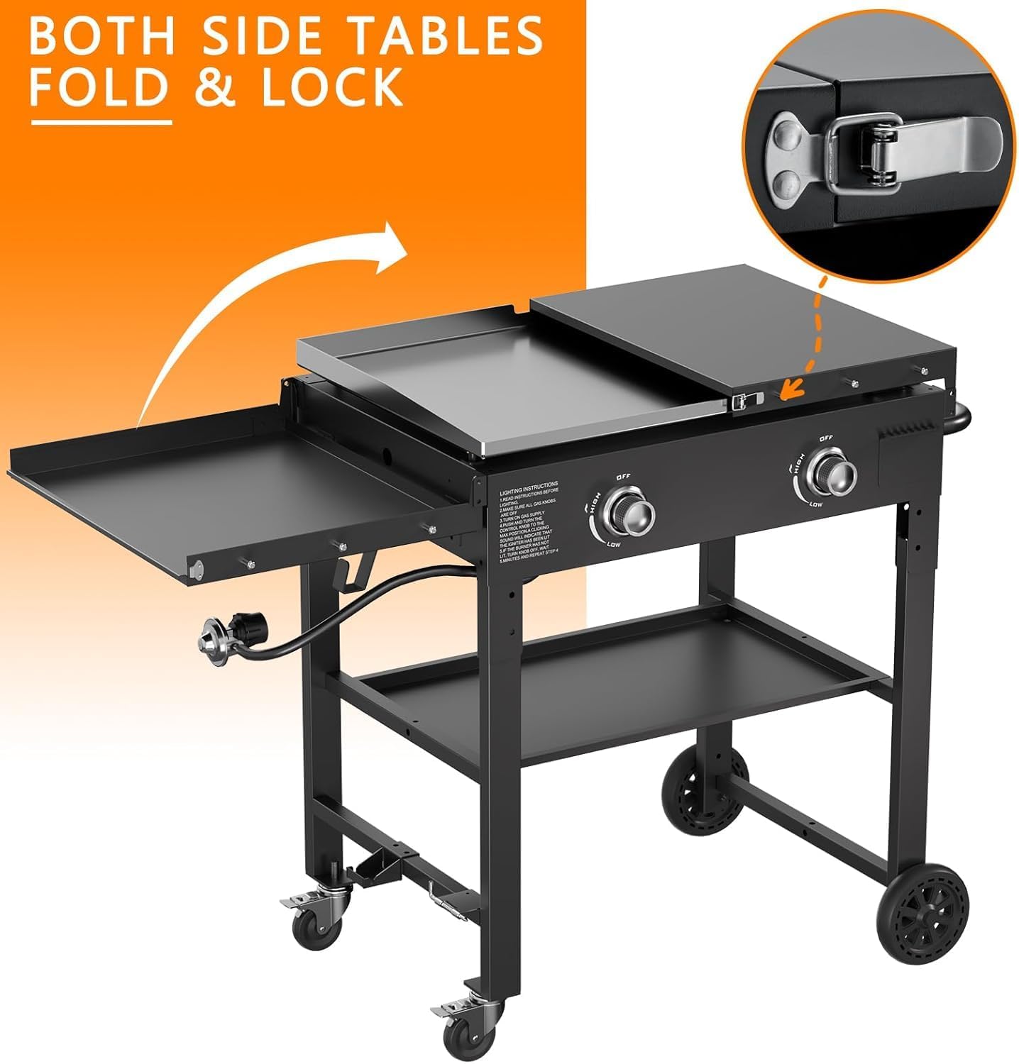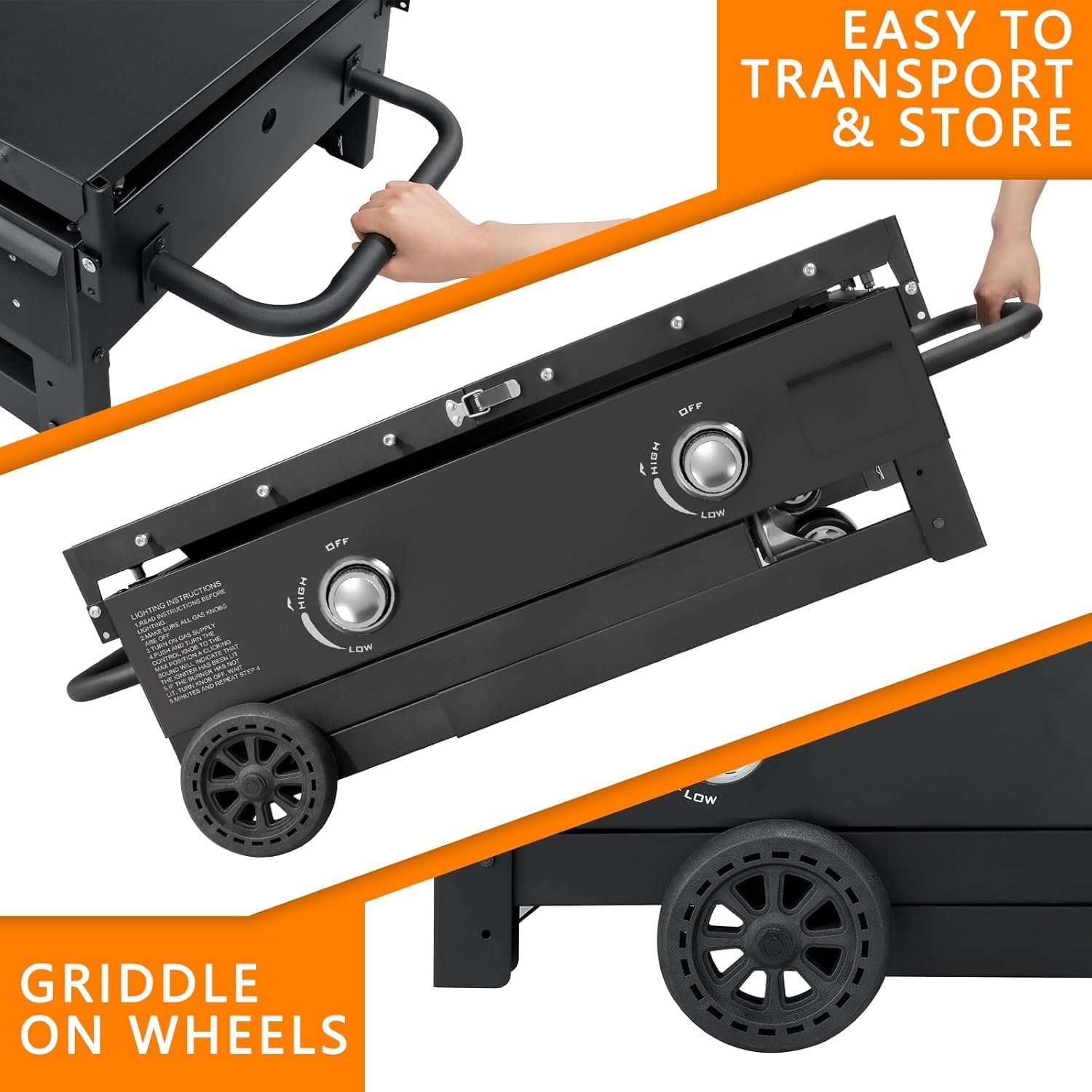 • Even Heating & Controllable Heat Zones: 2 independently controlled stainless-steel tube burners with 15, 000 BTU make a total of 30, 000 BTUs controlled low to high for versatile cooking options. And propane griddles have the option of creating different heat regions by playing with the burners.