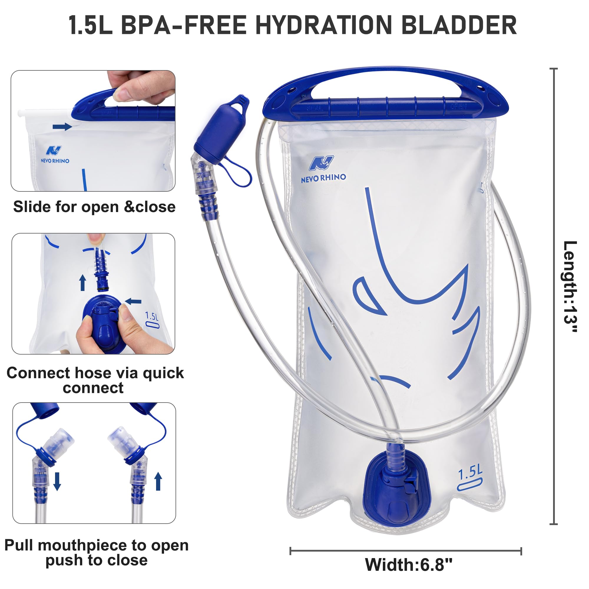 - Hydration Bladder & Neck Gaiter: Hydration bag with a weight of just 130 g (4.59 oz) and a size of 13.4 x 7.9 inches, suitable for small and medium-sized women, about 110-140 pounds. Equipped with a 1.5 L water bladder made from food-grade material, free of BPA. The hydration bladder features pressure resistance and leak-proofness, ensuring sufficient water supply during various outdoor activities,it also come with neck gaiter (UV-protective face cover or sweatband)
