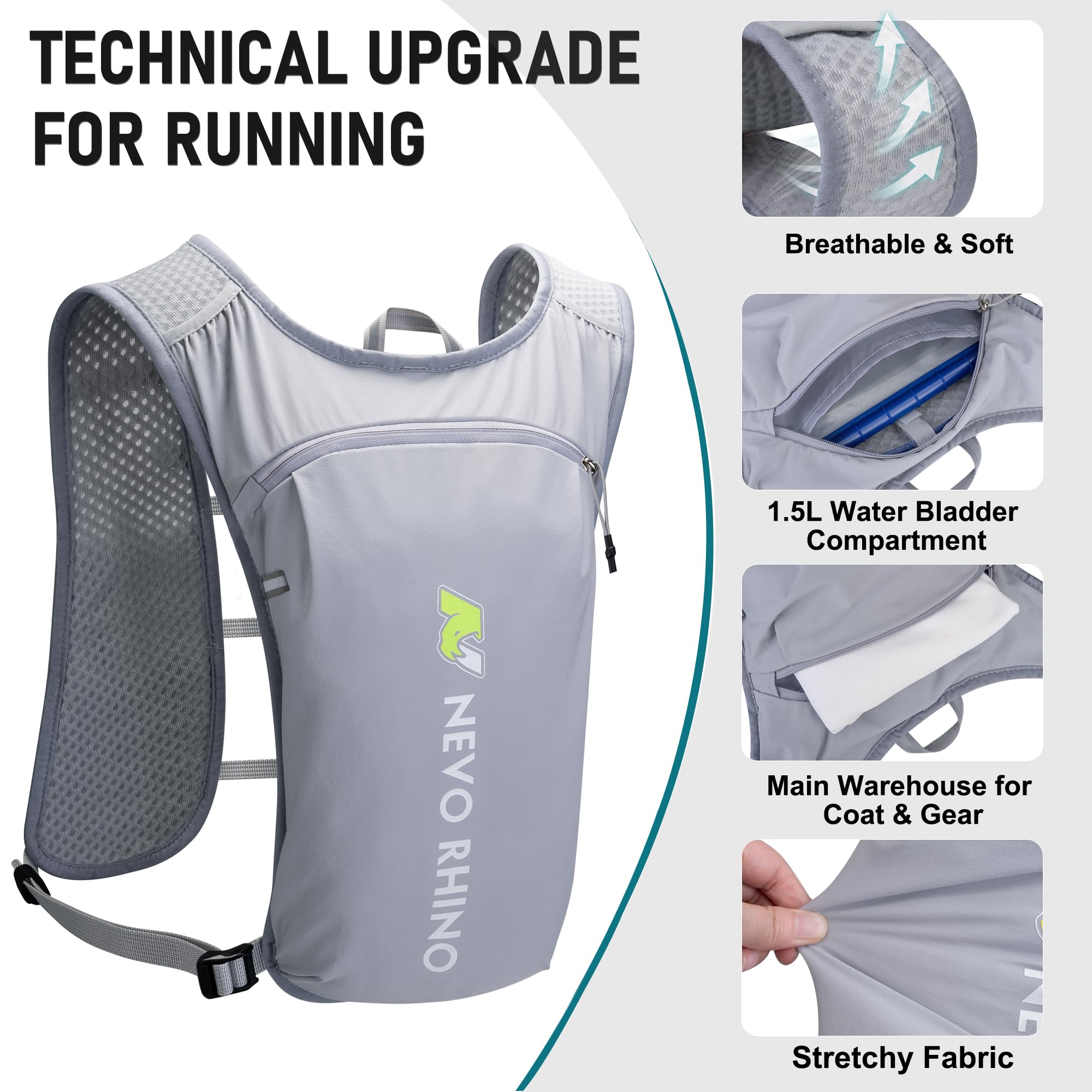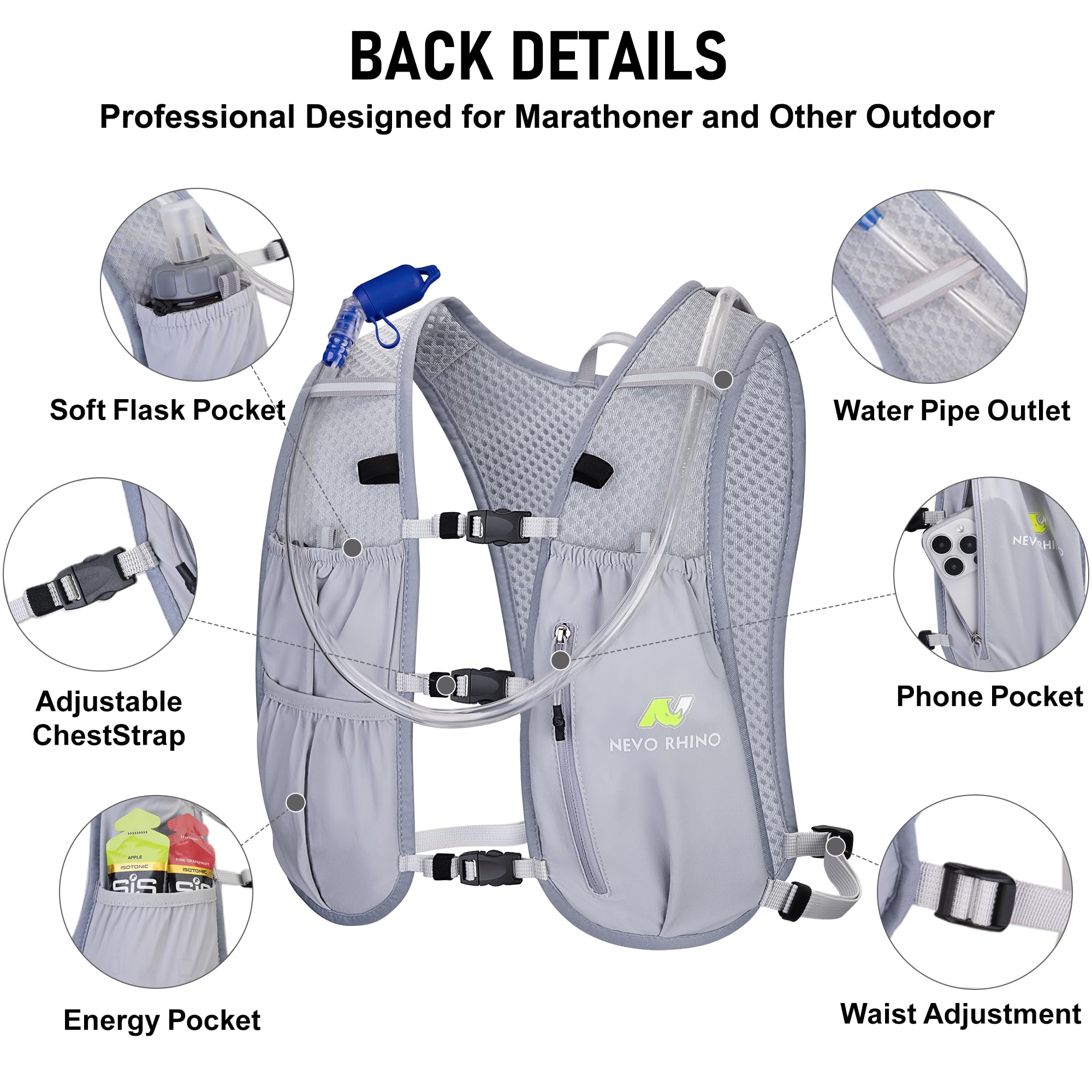 - Security and Multiple Storages: Reflective NEVO RHINO logo for nighttime safety and the Survival whistle in the front pocket for emergencies. There are also two soft flask pockets (soft flask not included), a zipper pocket and a small pocket. You can put gel soft candy, paper, a towel, a mobile phone, and a key in the front pocket