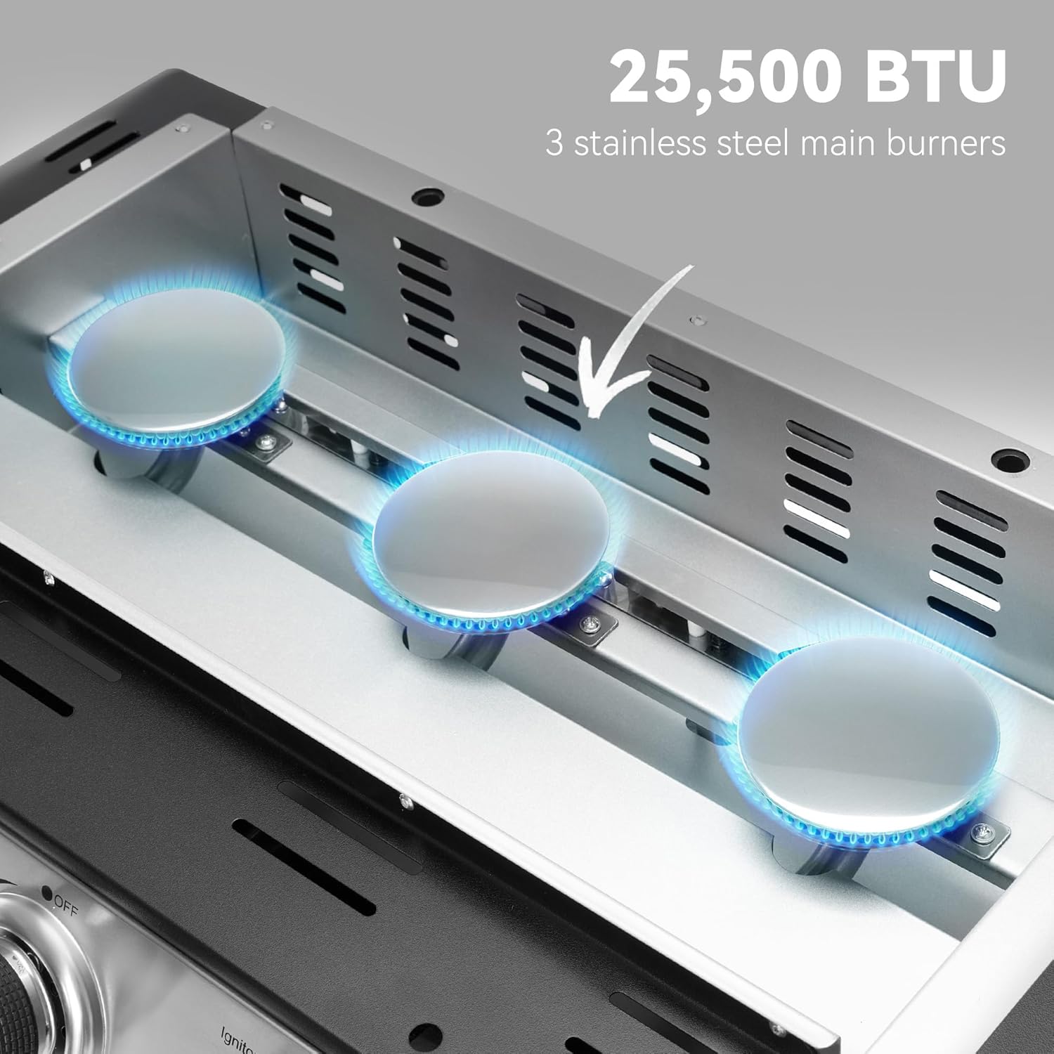 • Fast Heating: Three separately controlled burners offer an overall of 25,500 BTU cooking power, while integrated piezo ignitor provides instant ignition featuring by the simple push of a button